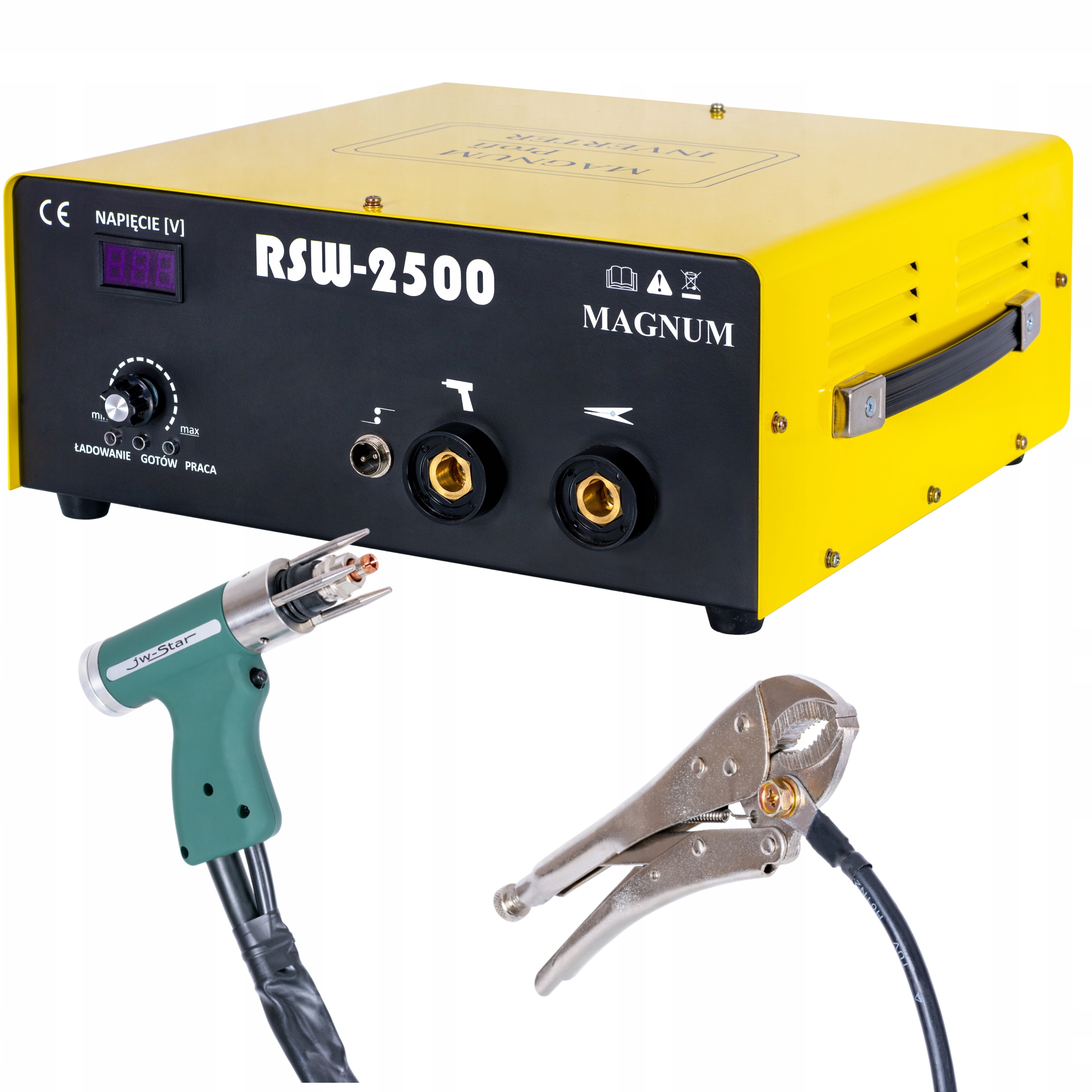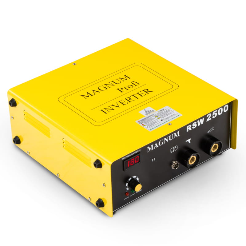 - Wyposażenie: przypawarka RSW 2500, pistolet do trzpieni, uchwyty do trzpieni (M4-M6) - 3 szt, kluczy do montażu, trzpieni, przewód masowy z podwójnymi szczypcami,instrukcję obsługi PL